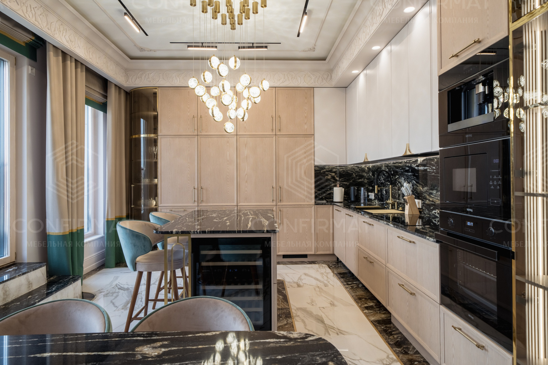 Яркий представитель классической кухни в современном исполнении. Важно не перегружать пространство, чтобы каждый элемент был заметен.