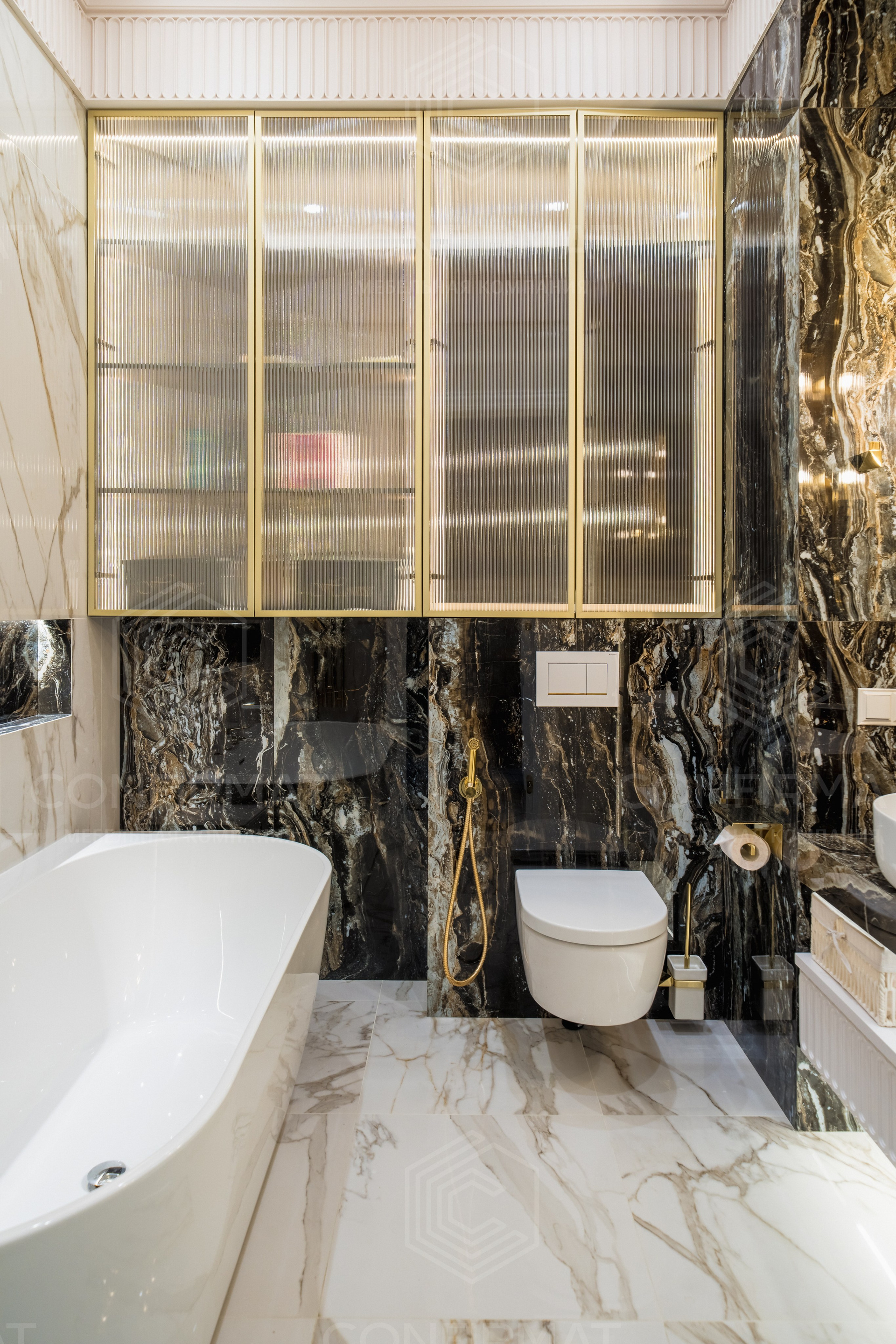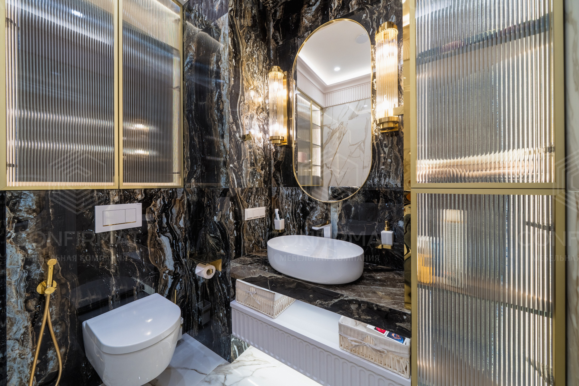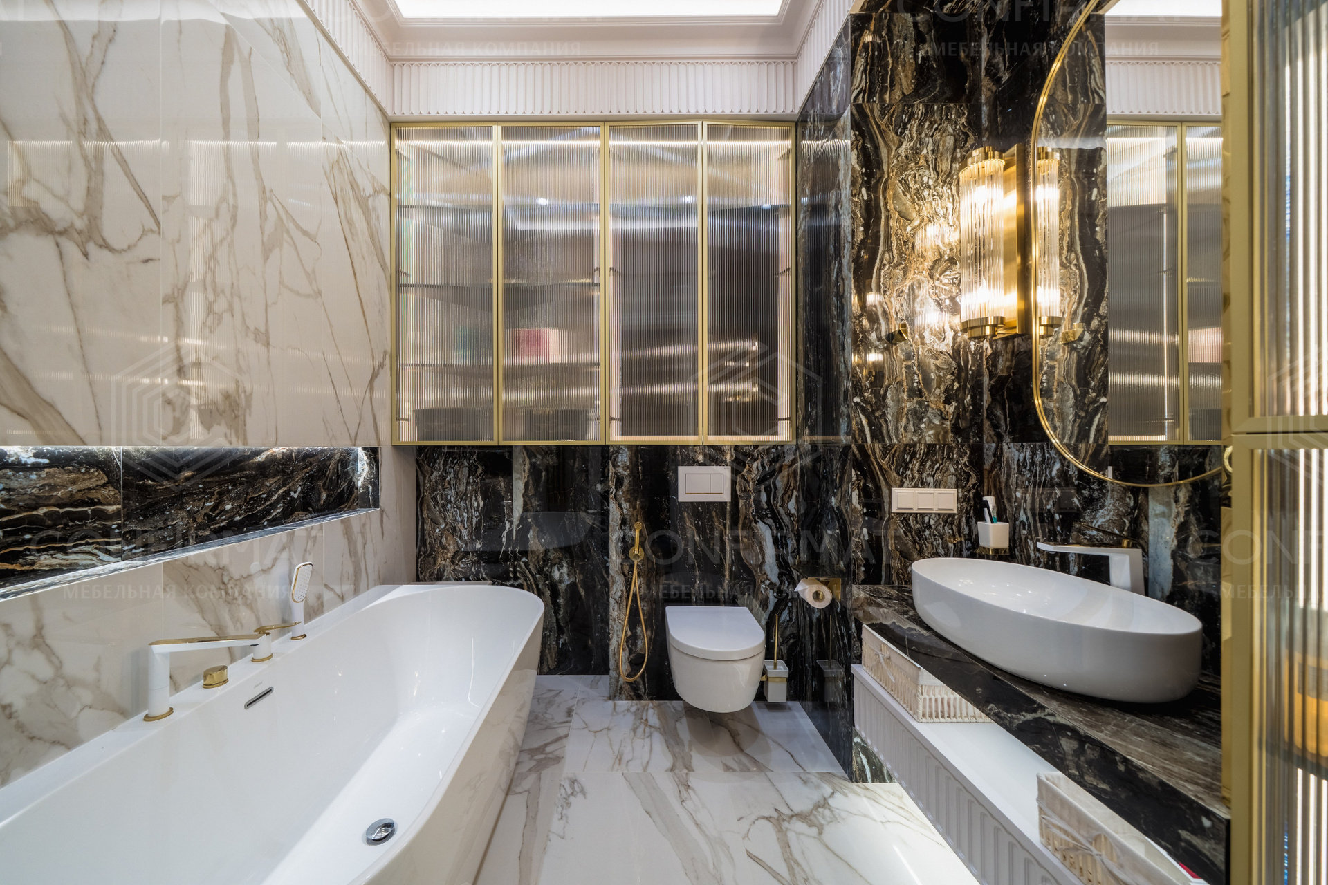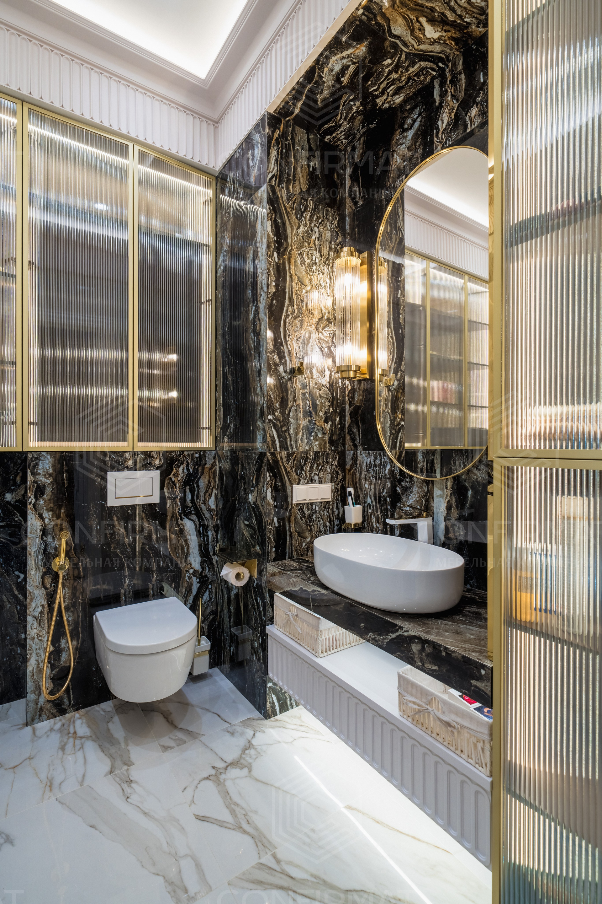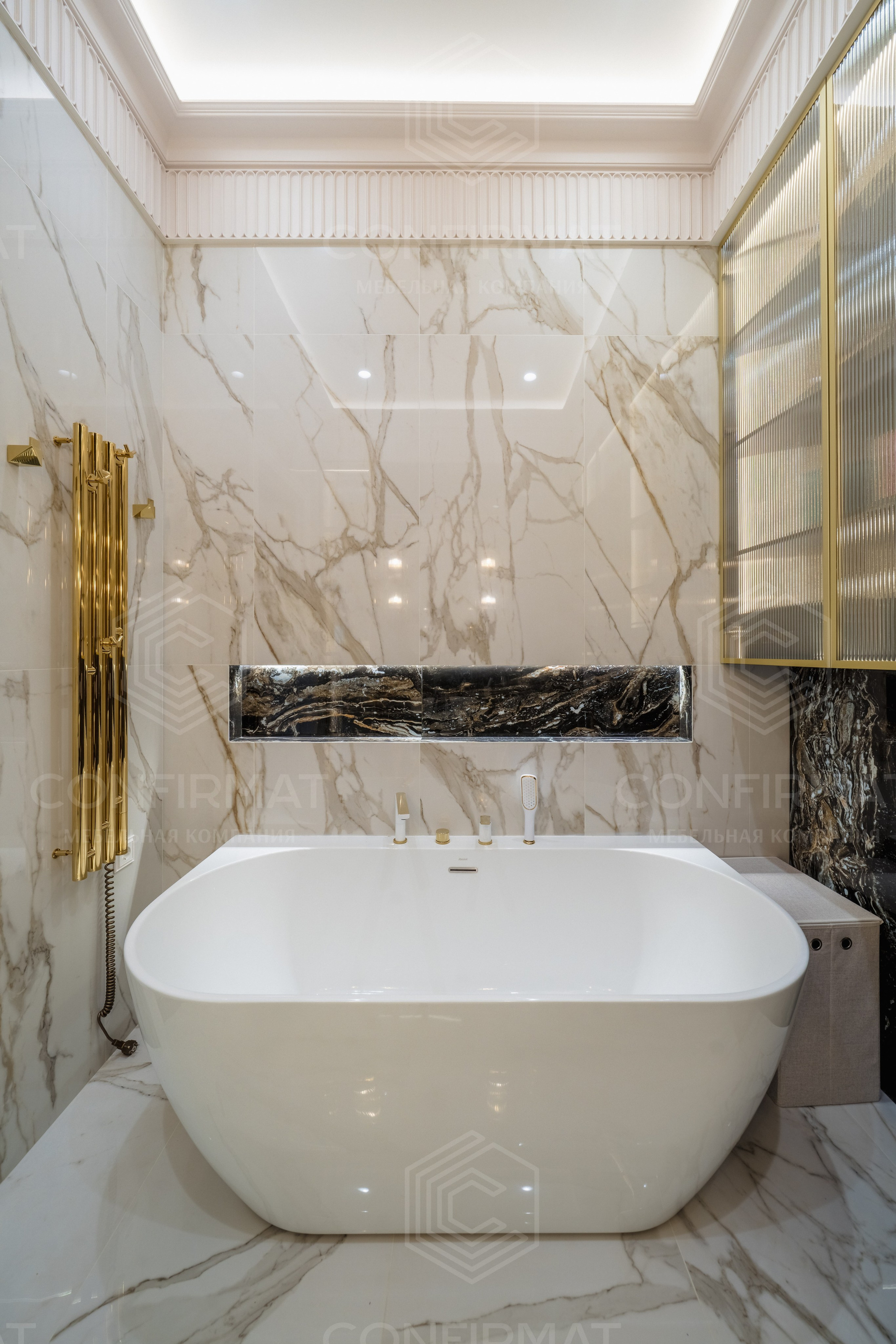 Неоклассика. Этот стиль предполагает симметрию, молдинги, благородные материалы, но без пышности. Неоклассика сочетается с современными элементами: подвесными тумбами, встроенной подсветкой, лаконичной сантехникой.