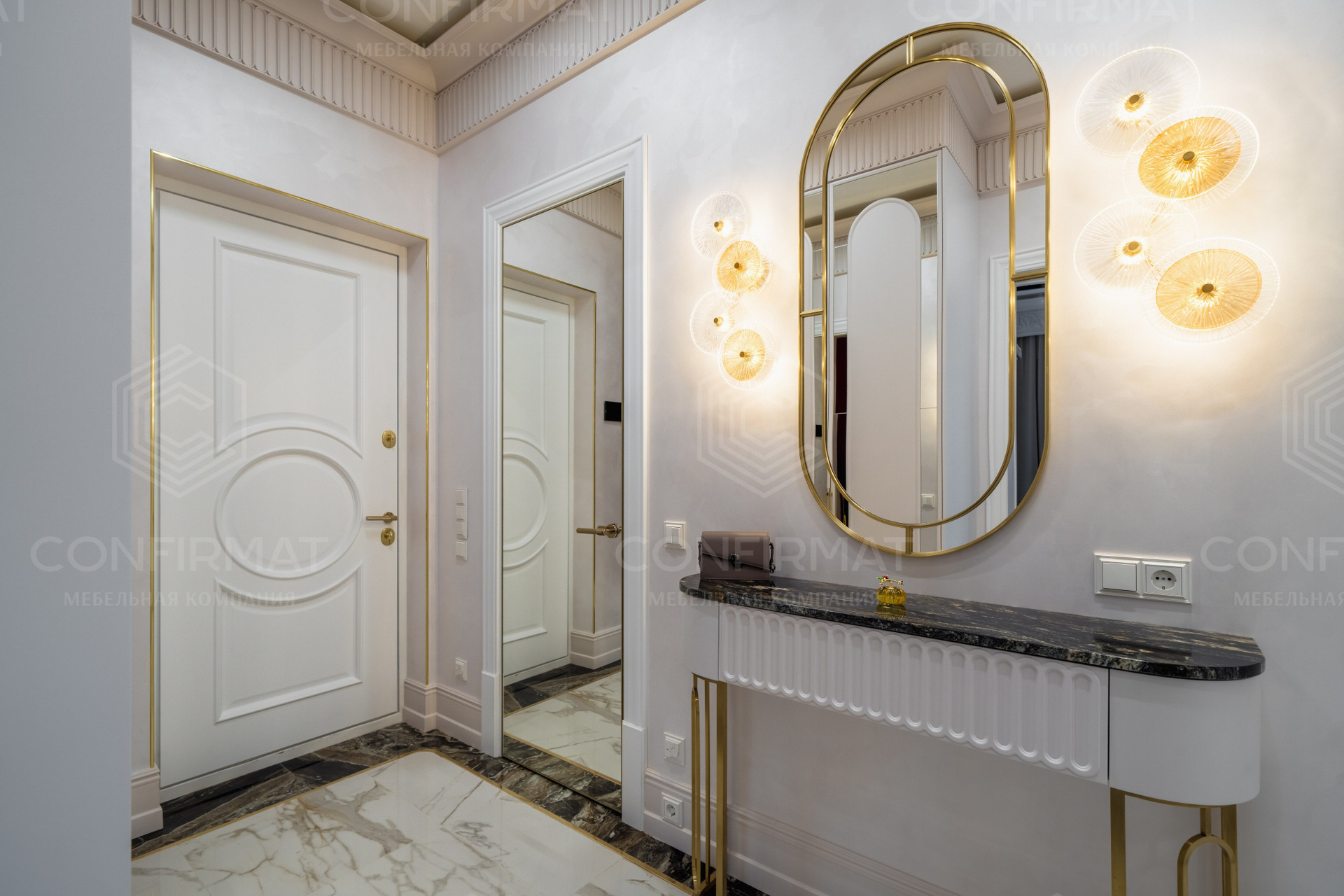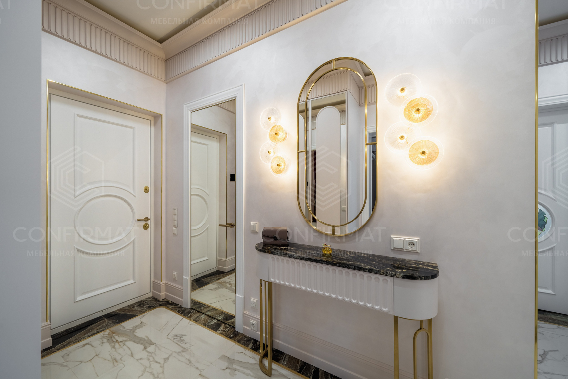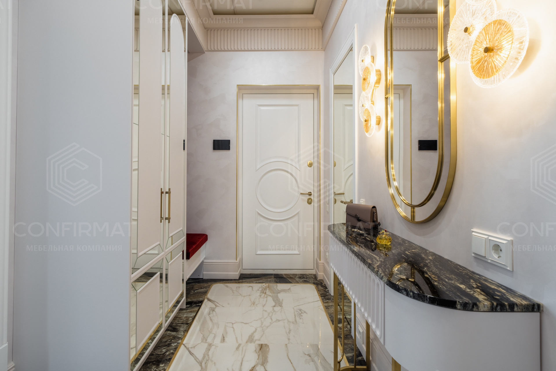 Неоклассический стиль больше подходит для просторных прихожих, но даже если помещение небольшое, можно использовать дизайнерские приёмы, чтобы визуально его расширить.